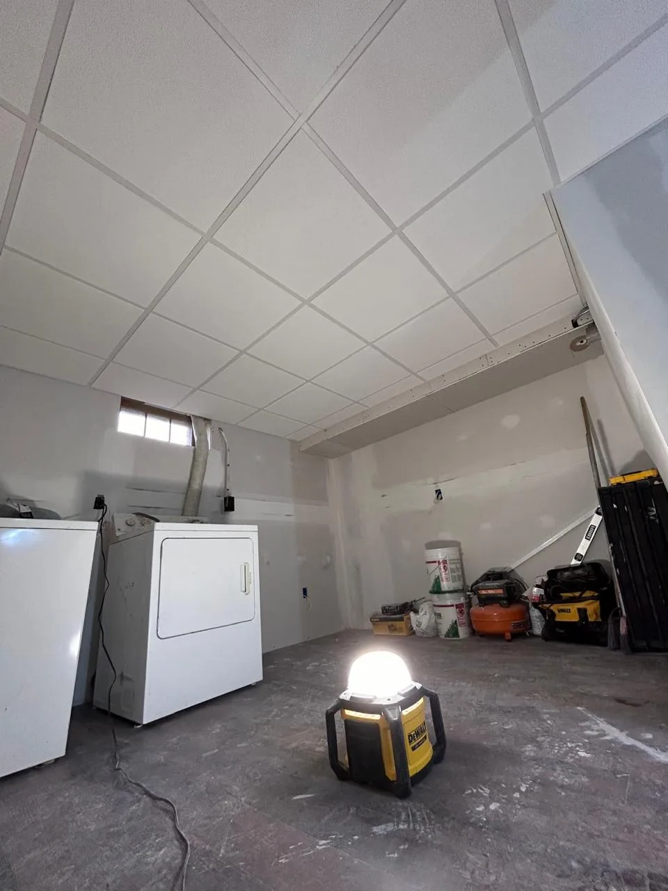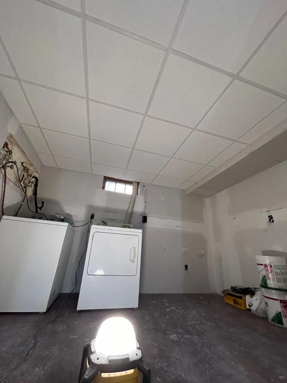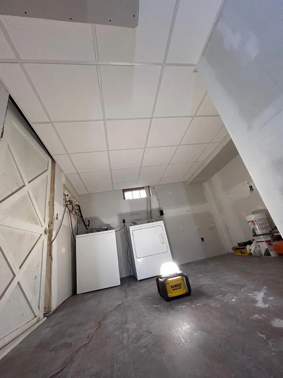 This basement laundry room was transformed with a professionally installed drop ceiling, improving both the aesthetics and practicality of the space. The new ceiling enhances lighting, provides easy access to utilities, and gives the area a clean, finished look.