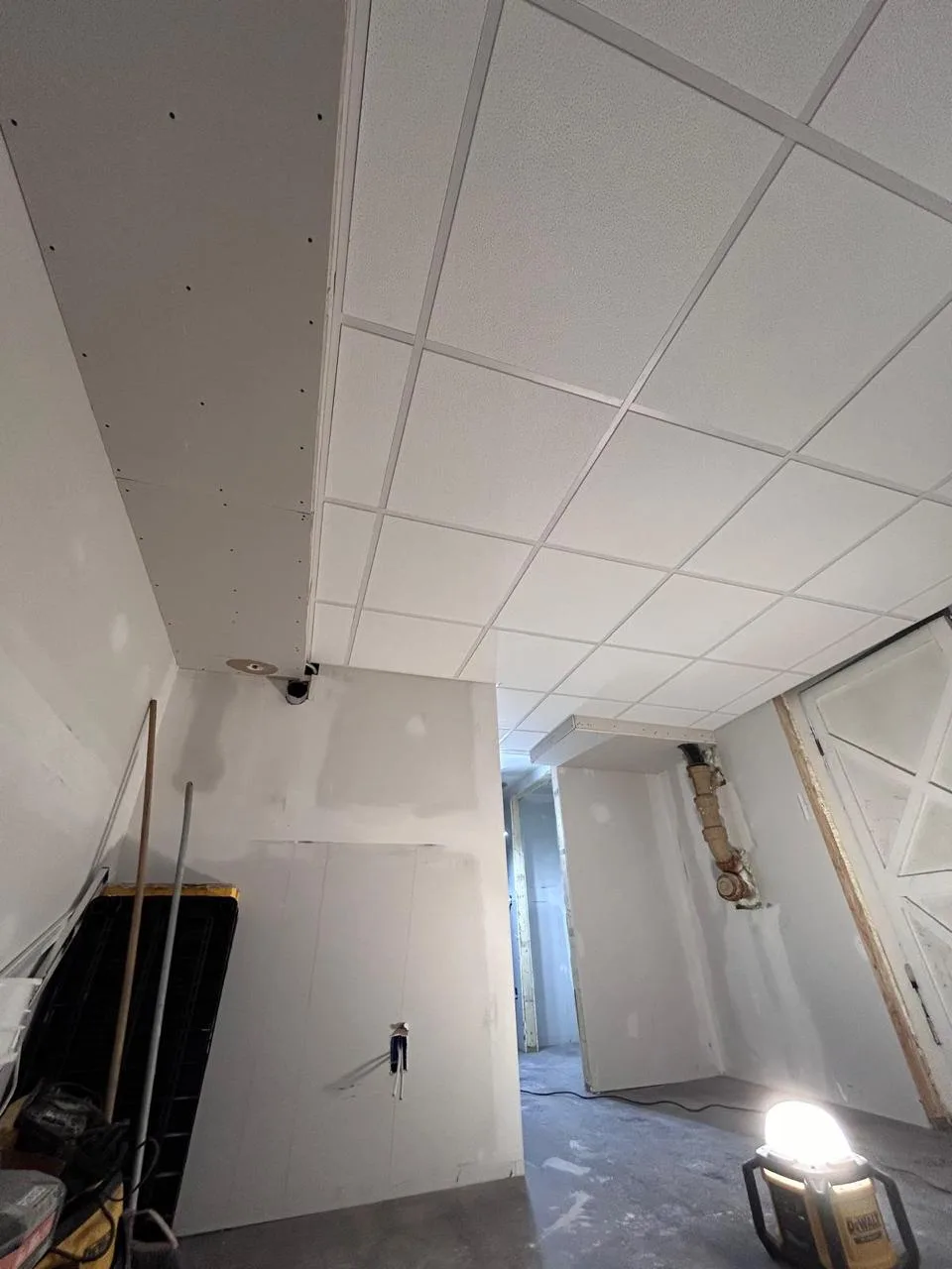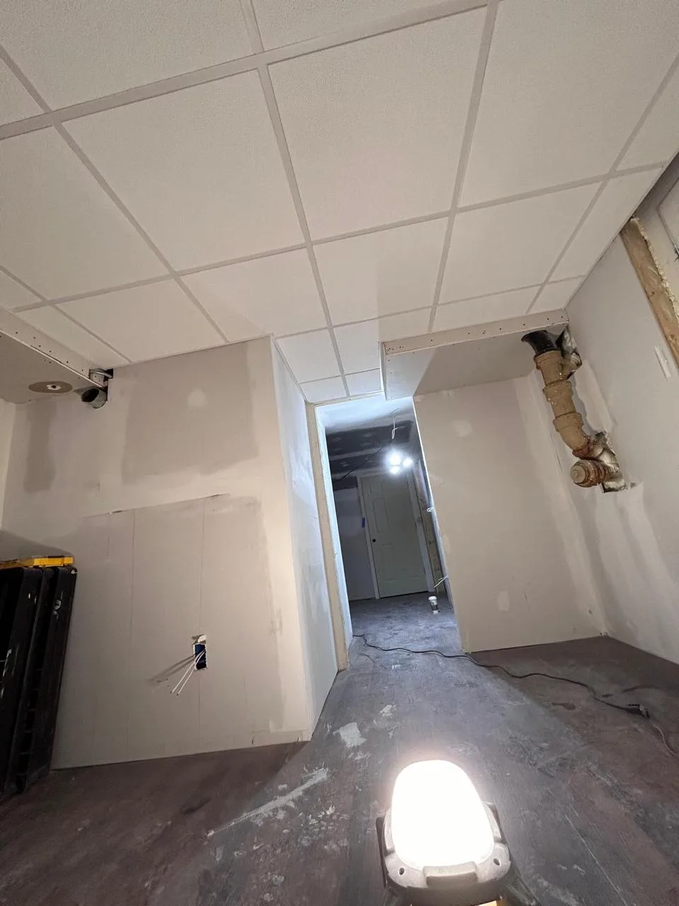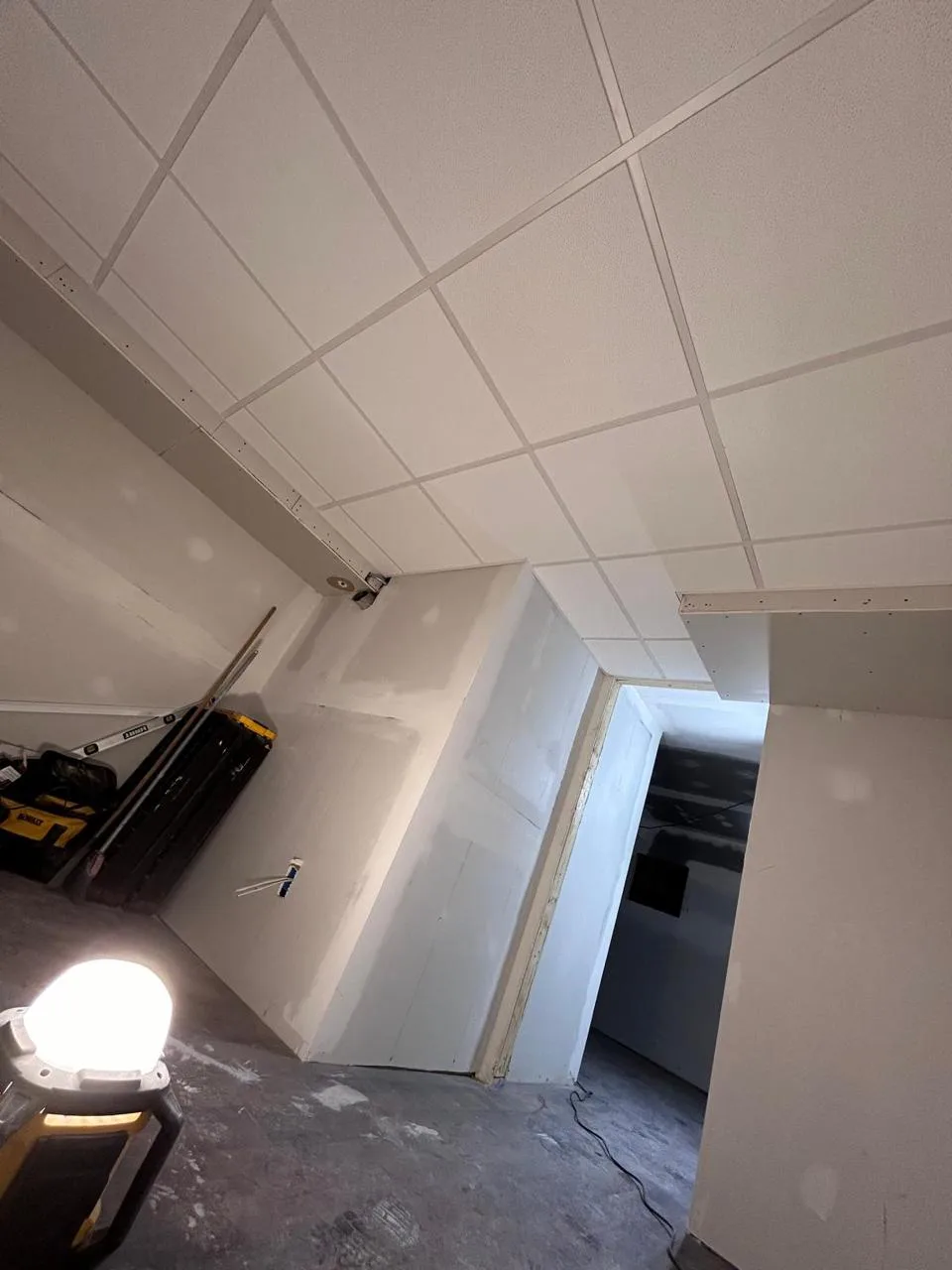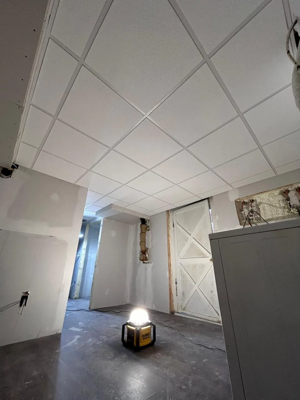 This basement laundry room was transformed with a professionally installed drop ceiling, improving both the aesthetics and practicality of the space. The new ceiling enhances lighting, provides easy access to utilities, and gives the area a clean, finished look.